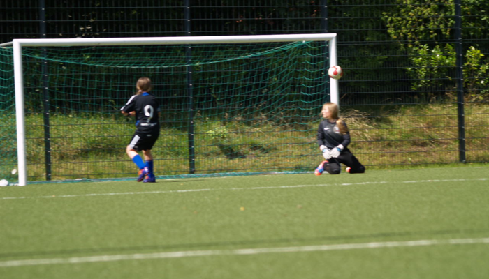 Für die Rauten hütete heute Daytona das Tor, auf dem Feld traten Sophia, Michelle, Olivia, Leonie, Finja, Lea und Lena an. Damit waren überwiegend offensive Spielerinnen vertreten, ungewohnterweise starteten daher Sophia und Michelle zusammen mit Olivia in der Abwehr und Leonie, Finja und Lea in der Offensive. Den Drang nach vorne konnte Sophia aber nicht unterdrücken, schon in der 2. Minute startete sie einen Angriff auf das Walddörfer Tor, ihr Schuss wurde aber abgewehrt. Im Gegenzug versuchten auch die Gastgeber ihr Glück, doch Daytona behielt die Ruhe und fing den Schuss ab. In der 4. Minute konnte Sophia einen Torabstoß abfangen, passte zu Finja, die legte Leonie vor, die leider einen Schritt zu spät kam, um aufs Tor abzuziehen. Nur eine Minute später versuchte sich Lea nach einem Einwurf, doch auch ihr Schuss wurde gehalten. Die Walddörfer konterten jetzt über links, doch wieder war Daytona zur Stelle. In der 10. Minute passte Leonie auf Lea, deren Schuss wurde jedoch abgewehrt und auch der Nachschuss gelangte nicht über die Torlinie. Finja legte noch einmal auf Lea vor, doch dieses Mal ging der Ball knapp am Tor vorbei. Nur zwei Minuten später versuchte auch Michelle ihr Glück, doch ihr guter Schuss wurde abgewehrt. Lea bekam eine Verschnaufpause und Lena startete in ihr erstes Spiel für die Rauten. Bisher waren die Chancen eindeutig auf Seiten des HSV, doch in der 15. Minute war Daytona richtig gefordert: einen starken Schuss und zwei Nachschüsse wehrte sie ganz prima ab. Sophia startete direkt einen Konter, doch ihr Schuss wurde leider gehalten. Auch eine Ecke der Rauten brachte keinen Erfolg. In der 20. Minute verletzte sich Sophia und wurde von Lea ersetzt. In der 23. Minute konnte Olivia zu Michelle nach vorne flanken, die legte Leonie vor, deren Schuss wurde aber leider gehalten. Nach kurzer Pause kam Sophia für Leonie zurück ins Spiel. In der 25. Minute schickte Daytona Sophia mit einem weiten Torabstoß nach vorne, doch der Schuss bekam nicht genug Schwung und war keine Herausforderung für die Torwärtin. Nur eine Minute später legte Olivia Sophia vor, die gab an Lena weiter, die aber etwas verzog. In der 27. Minute passte Sophia zu Finja, ihr toller Schuss wurde zur Ecke abgewehrt. Schon in der nächsten Minute bekam Finja eine zweite Chance, dieses Mal landete der Ball leider am Pfosten. Ebenso landete eine schöne Kombination von Lena über Sophia zu Finja am Pfosten, der Nachschuss wurde abgewehrt. So ging es 0:0 in die Halbzeitpause.